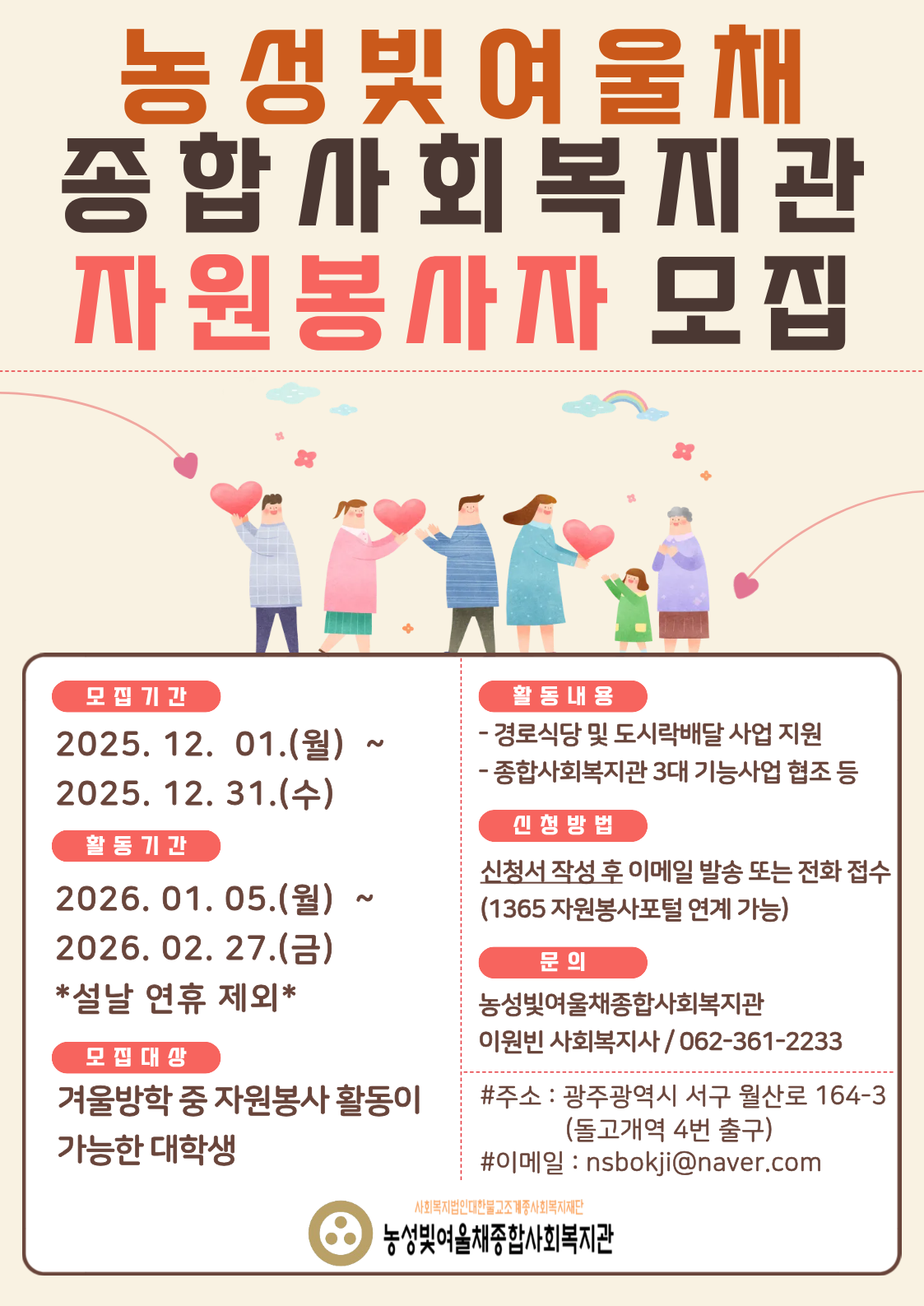 [홍보] 농성빛여울채종합사회복지관 자원봉사자 모집 안내