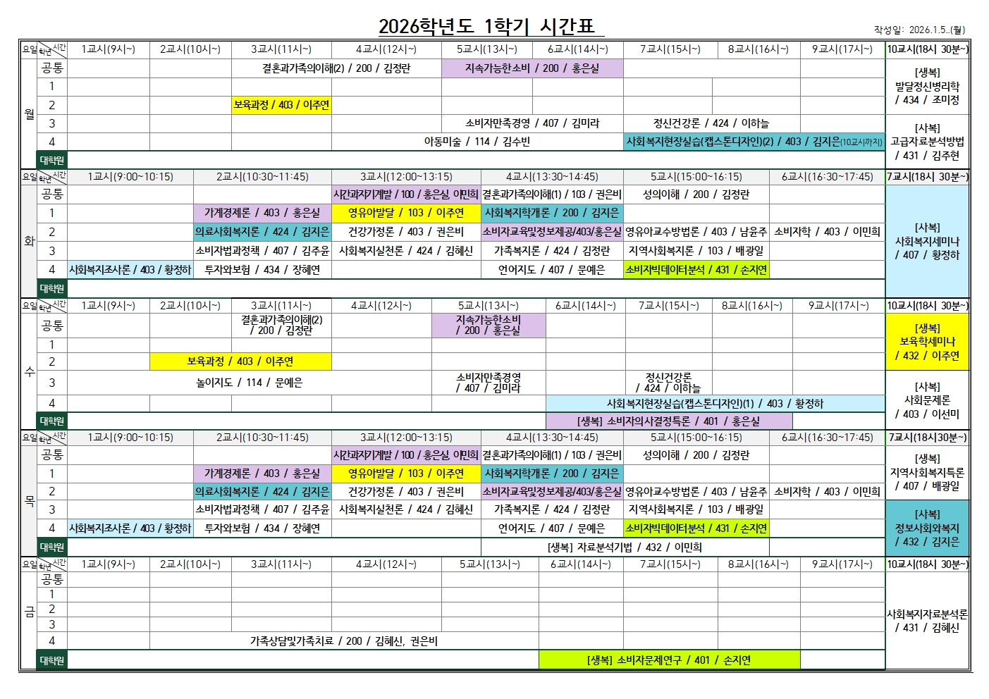 [2026학년도 1학기 시간표] 생활복지학과 및 대학원 생활환경복지학과, 사회복지학협동과정